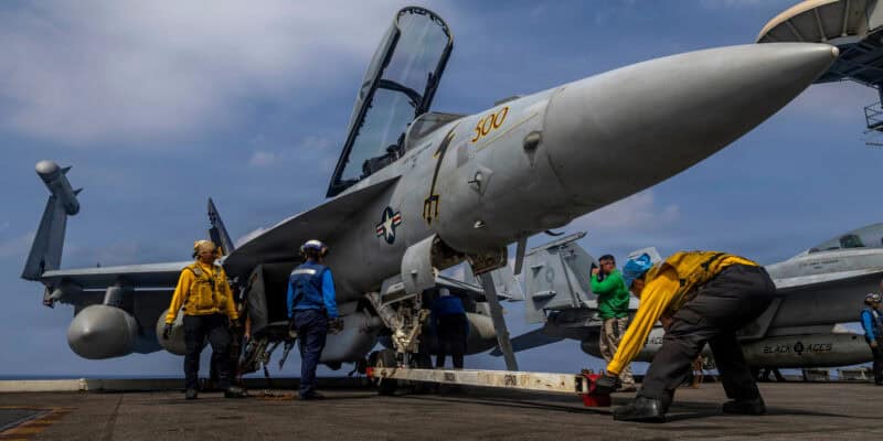 This photo provided by the U.S. Navy shows sailors preparing a Boeing EA-18G Growler on the flight deck of the Nimitz-class aircraft carrier USS Abraham Lincoln in the Indian Ocean on Jan. 21, 2026. (Mass Communication Specialist Seaman Daniel Kimmelman/U.S. Navy via AP)