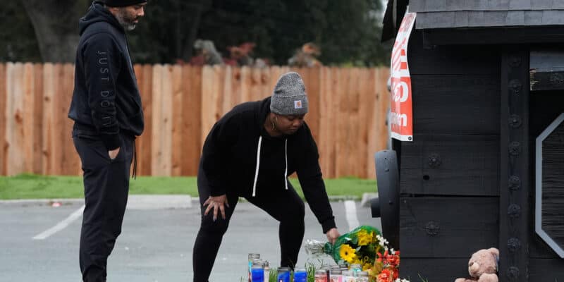 Aundre Smith, left, watches as Genesis Smith places flowers near the scene of a mass shooting on Saturday at a banquet hall in Stockton, Calif., Monday, Dec. 1, 2025. (AP Photo/Jeff Chiu)