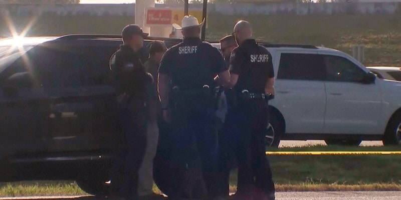 Law enforcement officials investigate a vehicle near the scene of a deadly shooting shooting early Saturday, Oct. 4, 2025 in the Houston suburb of Angleton, Texas. (KTRK via AP)