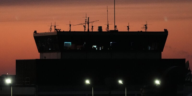 An air traffic control tower is seen at O'Hare International Airport in Chicago, Wednesday, Nov. 12, 2025. (AP Photo/Nam Y. Huh)