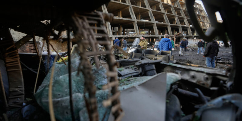 People inspect the site of an Israeli strike amid debris and damaged vehicles in Beirut, Lebanon, Wednesday, April 1, 2026. (AP Photo/Hassan Ammar)