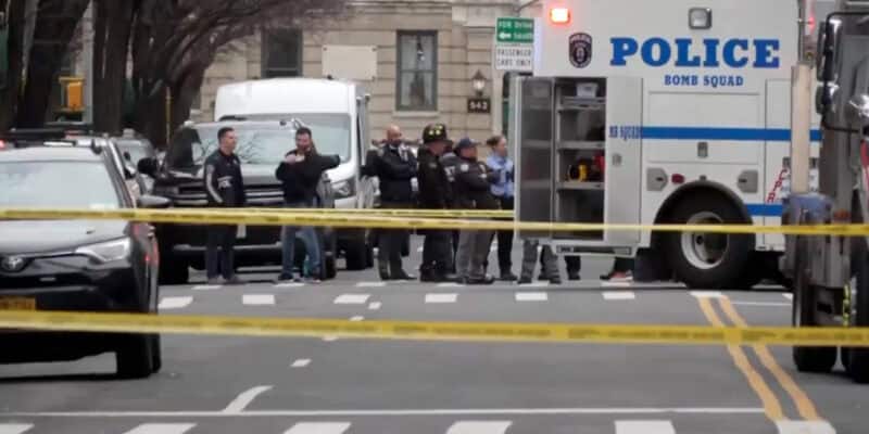 In this image taken from video, law enforcement officers respond to Manhattan's Upper East Side as New York City's police said they had identified a "suspicious device in a vehicle,” Sunday, March 8, 2026, in New York. (AP Photo/Joseph B. Frederick)
