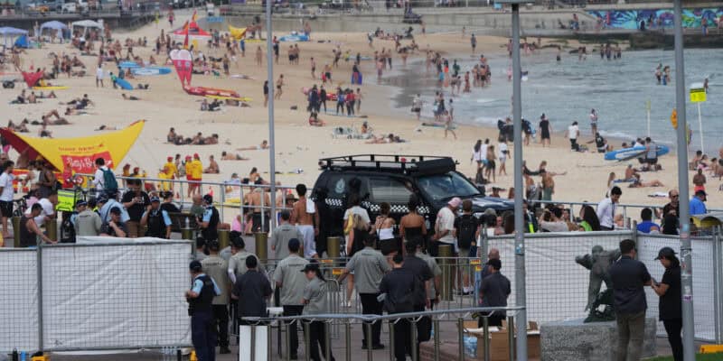 Security officers gather near a gate at Bondi Beach in Sydney, Sunday, Dec. 21, 2025, ahead of a ceremony to mark the National Day of Reflection for victims and survivors from the Bondi shooting on Dec. 14. (AP Photo/Mark Baker)