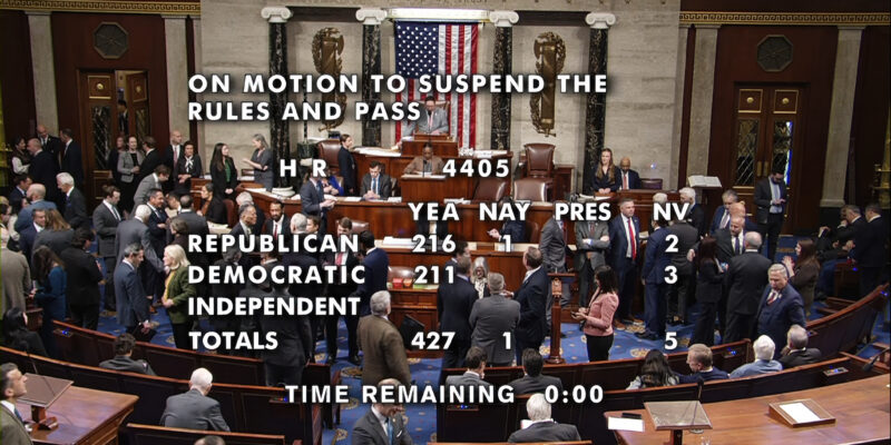 This image from House Television shows the final vote in the House to pass a bill to force the Justice Department to publicly release its files on the convicted sex offender Jeffrey Epstein, Tuesday, Nov. 18, 2025, at the u.S. Capitol in Washington. (House Television via AP)