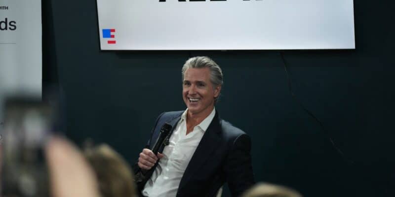 FILE -California Gov. Gavin Newsom speaks at a session at the We Mean Business Pavilion during the COP30 U.N. Climate Summit, Tuesday, Nov. 11, 2025, in Belem, Brazil. (AP Photo/Fernando Llano, File)