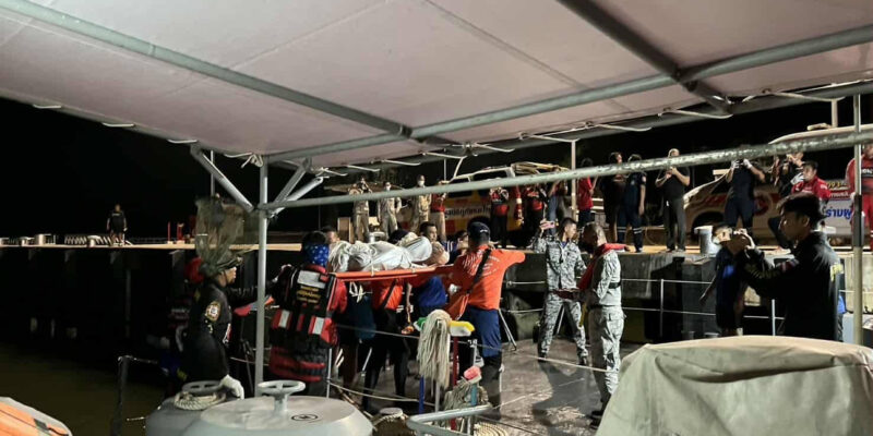 In this image released by Romsai Rescue Foundation Satun, Thai Navy carry a body which is believed to be one of passengers from a boat that believed sank near Tarutao island, Satun, southern Thailand, Sunday, Nov. 9, 2025. (Romsai Rescue Foundation Satun via AP)