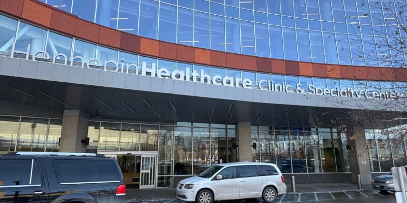 Cars are parked outside Hennepin County Medical Center on Tuesday, Jan. 20, 2026, in Minneapolis. (AP Photo/Sarah Raza)
