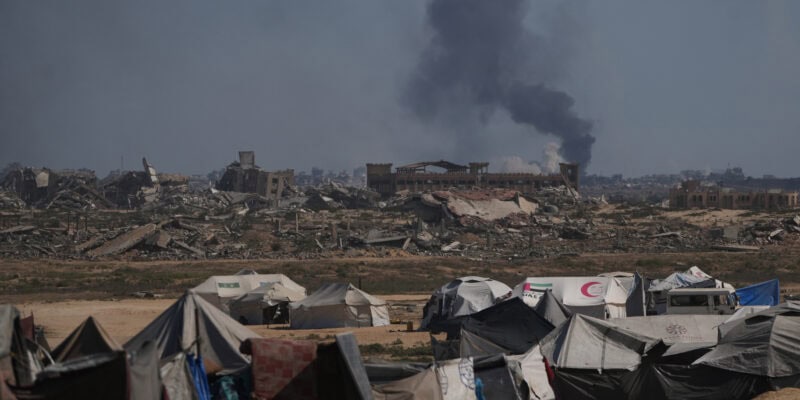 Smoke rises to the sky following an Israeli military strike in Gaza City, as seen from the central Gaza Strip, Thursday, Oct. 2, 2025. (AP Photo/Abdel Kareem Hana)
