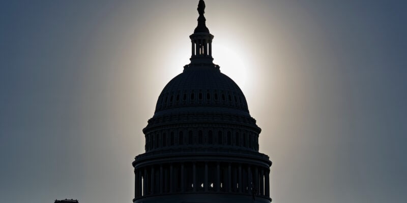 The U.S. Capitol is silhouetted by the stark glare of the morning sun as a government shutdown begins its tenth day, in Washington, Friday, Oct. 10, 2025. (AP Photo/J. Scott Applewhite)