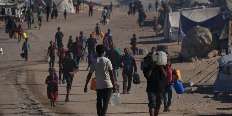 “There is no food, nor good water, and blockage of crossings,” said Um Sulaiman Abu Afash, a displaced woman from Gaza City. “Our kids sleep in the streets. We buy drinking water. Where do we go? There’s no mercy.”