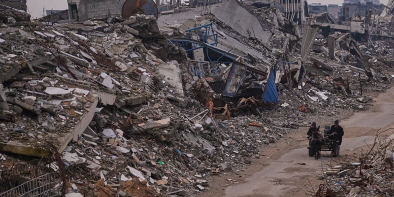 Palestinians pass along a street surrounded by buildings destroyed during Israeli air and ground operations in the Sheikh Radwan neighborhood, in Gaza City, Tuesday, Dec. 30, 2025. (AP Photo/Abdel Kareem Hana)