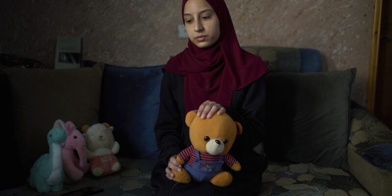 Tayma Asous, 26, holds the favorite toy of her 2-year-old daughter, Layla Al-Khatib, who was killed after being shot in the head by Israeli gunfire, at their home in the village of Muthallath ash-Shuhada, near the West Bank city of Jenin, March 11, 2025. (AP Photo/Leo Correa)