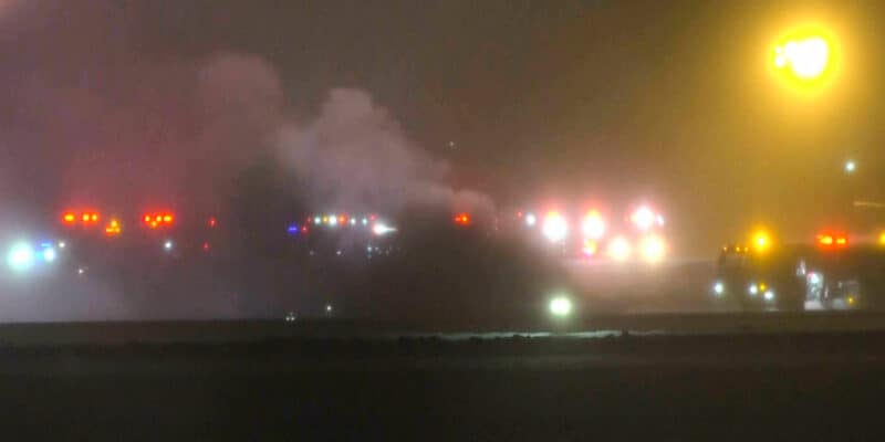This image taken from video provided by WABI television, emergency services work on a scene of the Bombardier Challenger 600 crash at the Bangor Airport in Maine, late Sunday, Jan. 25, 2026. (WABI via AP)