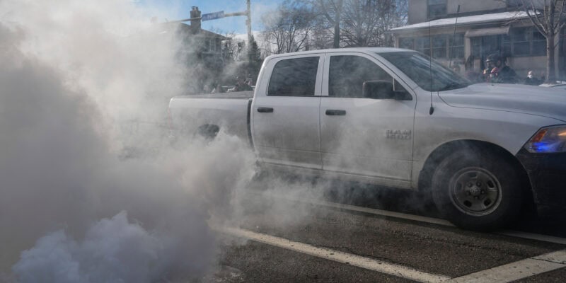 Federal agents drive through smoke from tear gas dispersed during a protest, Monday, Jan. 12, 2026 in Minneapolis (AP Photo/Adam Gray)