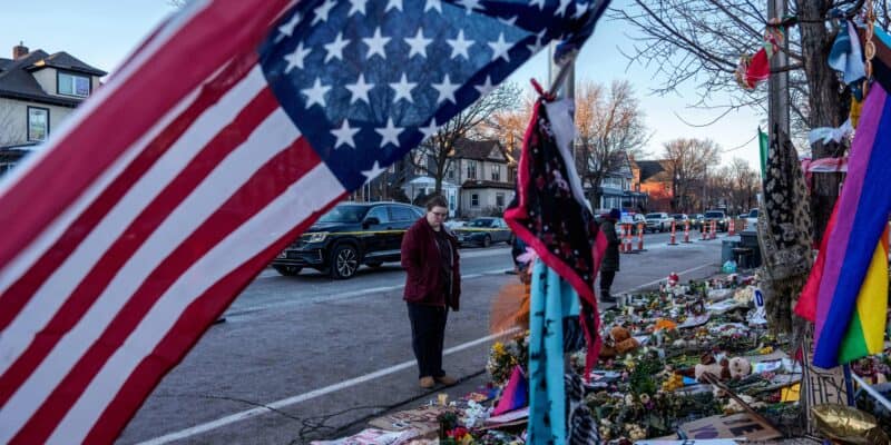 People visit a makeshift memorial for Renee Good, who was fatally shot by an ICE officer last week, Wednesday, Jan. 14, 2026, in Minneapolis. (AP Photo/Adam Gray)