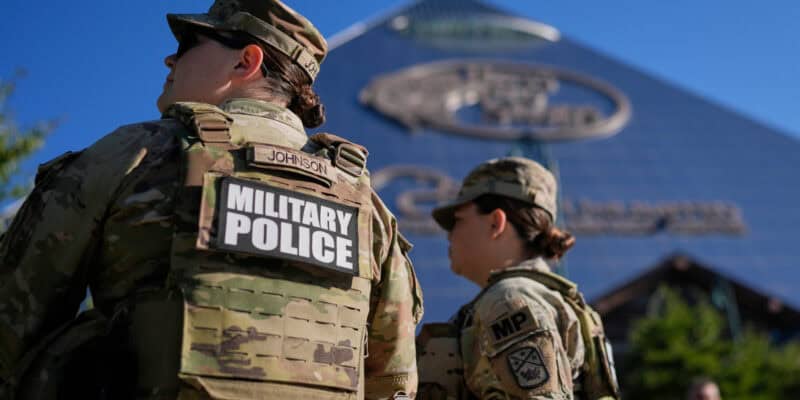 At least nine armed Guard members began their patrol at the Bass Pro Shops located at the Pyramid, an iconic landmark in Memphis, and a nearby tourist welcome center along the Mississippi River. Wearing Guard fatigues and protective vests labeled “military police,” they were being escorted by a local police officer and posed for photos with visitors.