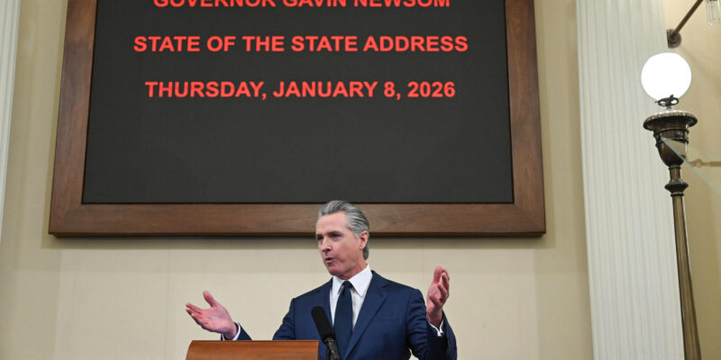 Gov. Gavin Newsom gives his State of the State address at the State Capitol on Thursday, Jan. 8, 2026, in Sacramento, Calif. (Hector Amezcua/The Sacramento Bee via AP, Pool)