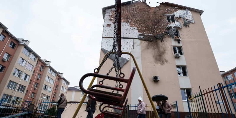 People walk in front of a house which was damaged after a Russian strike on residential neighbourhood in Kriukivshchyna, Kyiv region, Ukraine, on Friday, April 3, 2026. (AP Photo/Evgeniy Maloletka)