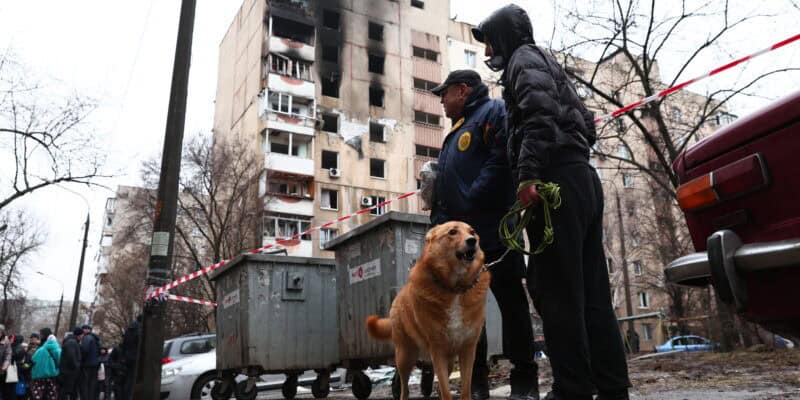 Local residents walk a dog near a damaged apartment building hit by Russian drone in Zaporizhzhia, Ukraine, Thursday, Feb. 26, 2026. (AP Photo/Kateryna Klochko)