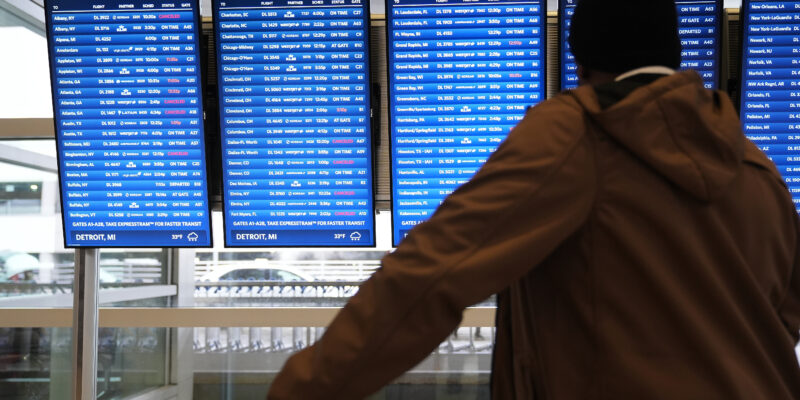 Travelers wait at a video board at the Detroit Metropolitan Airport, Sunday, Nov. 9, 2025, in Detroit. (AP Photo/Ryan Sun)