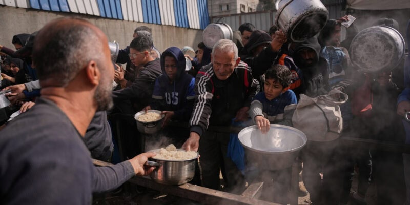 Palestinians receive donated food at a community kitchen in Nuseirat, in central Gaza Strip, Saturday, Jan. 24, 2026. (AP Photo/Abdel Kareem Hana)
