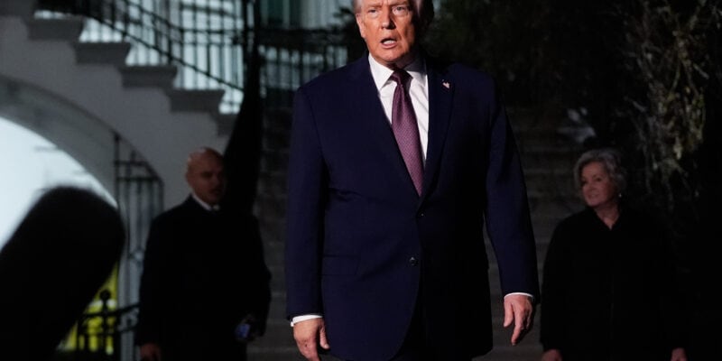 President Donald Trump walks to speak with reporters while departing the White House as chief of staff Susie Wiles, right, looks on, Friday, Dec. 19, 2025, in Washington. (AP Photo/Julia Demaree Nikhinson)