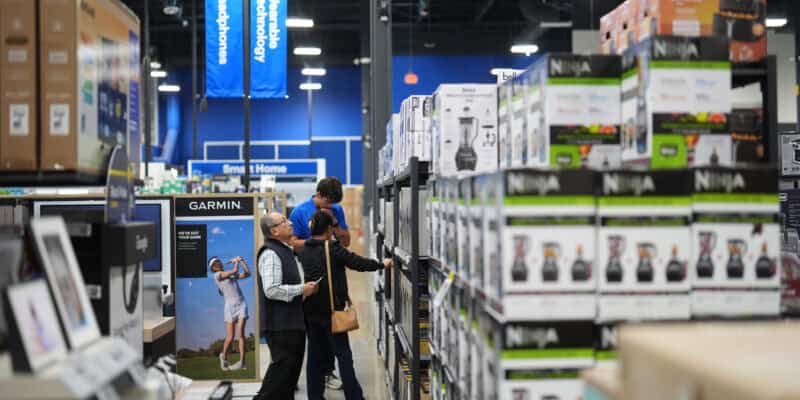 People shop among early Black Friday sale items at Best Buy Thursday, Nov. 20, 2025, in San Diego. (AP Photo/Gregory Bull)