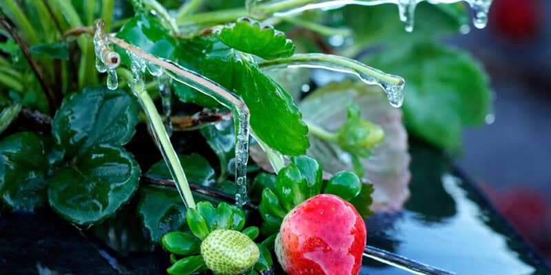 In Plant City, which bills itself as the winter strawberry capital of the world, growers used sprinklers to spray strawberry plants and ornamental plants with water that formed a protective ice as the overnight temperature went as low as 28 F (minus 2.2 C). The ice kept the plants’ temperatures from going below freezing. Plant City is about 20 miles (32 kilometers) east of Tampa.